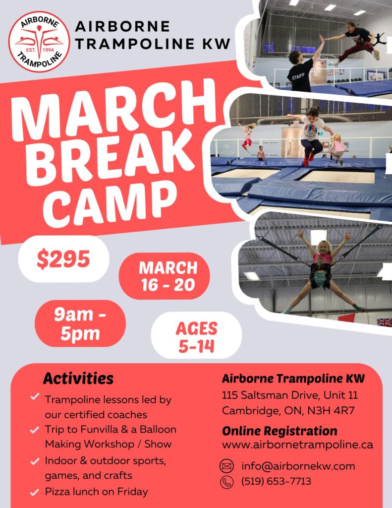 Airborne’s Trampoline Camp is the only Trampoline camp in KW where kids get taught how to jump safely and learn skills on trampolines. All of our coaches are NCCP Trampoline Certified.